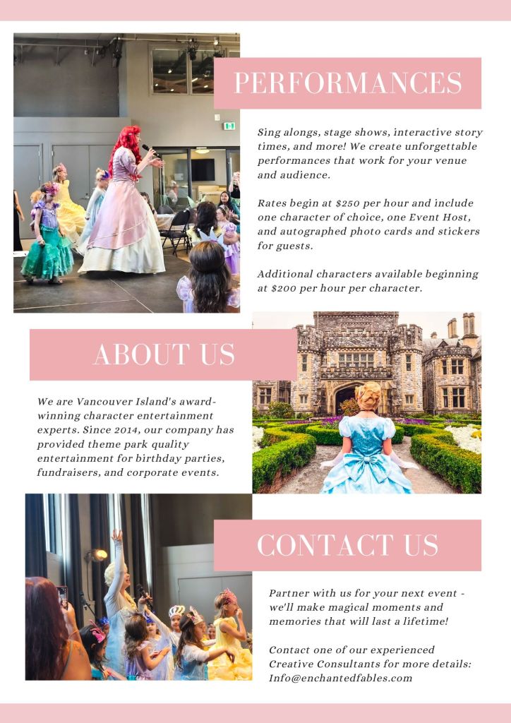 princess parties victoria. what to do for kids birthdays in victoria bc. what to do for kids birthday parties in cowichan lake area. kids birthday’s vancouver island. special event entertainment. princess performers for kids birthday parties. charity event entertainment. character performers. fun things for kids in victoria. langford. royal oak. sooke. cowichan lake. happy valley. British Columbia. five year old birthday party ideas. six year old birthday party ideas. four year old birthday party ideas in victoria bc. three year old birthday party ideas. fun ideas for kids birthday parties on vancouver island. Enchanted Fables. Enchanted princess parties. Enchanted Fables princess parties. girls birthday parties near me. girl princess birthday ideas near me. island princess parties. island princess party. island princess performer. vancouver island princess parties. corporate event ideas victoria bc. corporate event ideas vancouver island. corporate event performer victoria.princess parties victoria. what to do for kids birthdays in victoria bc. what to do for kids birthday parties in cowichan lake area. kids birthday’s vancouver island. special event entertainment. princess performers for kids birthday parties. charity event entertainment. character performers. fun things for kids in victoria. langford. royal oak. sooke. cowichan lake. happy valley. British Columbia. five year old birthday party ideas. six year old birthday party ideas. four year old birthday party ideas in victoria bc. three year old birthday party ideas. fun ideas for kids birthday parties on vancouver island. Enchanted Fables. Enchanted princess parties. Enchanted Fables princess parties. girls birthday parties near me. girl princess birthday ideas near me. island princess parties. island princess party. island princess performer. vancouver island princess parties. Corporate event entertainment vancouver island. Special event entertainment. Disney Princess Parties. Disney character performers. Disney kids party. Frozen kids party. Frozen kids party Victoria bc. Elsa and Anna. Sleeping Beauty, Ariel, Rapunzel, Tangled, Merida, Snow White, Belle, Beauty and the Beast, Olaf, Alice in Wonderland party. Moana. Jasmine. Tea Parties in Victoria BC. kid party idea Victoria bc. kid party entertainment Victoria bc. star wars party Victoria bc. star wars. superhero party Victoria bc. superhero performer Victoria bc. Vancouver island superhero performer. dinosaur party Victoria bc. dinosaur party Vancouver island.